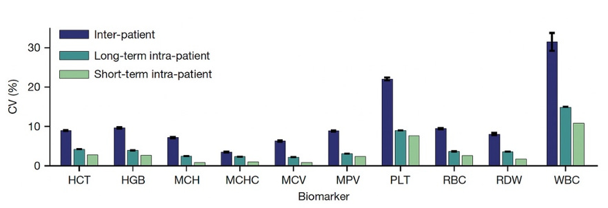 In his posting, Topol specifically addressed a recent paper in Nature magazine, which used CBC data (the most frequently obtained lab test, with over 2 million tests processed per day – or 500 million per year) (2). The reasons why population-based reference values are not reliable are, in this case, somewhat different: The investigators discovered that 9 indices of a CBC had remained quite stable over 20 years, fluctuating within a very narrow range, thus demonstrating a very low coefficient of variation (CV). Indeed, inter-individual variation was far greater than intra-individual variation for each of the CBC metrics, and long-term (15+ years) variation at the individual level was similar to short-term variations (see Figure below).