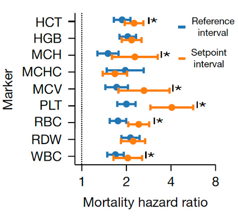 The paper then explored how mortality for all causes in a large study population could be predicted based on these 9 setpoints of a CBC. Once again, the Figure below reflects the very interesting results: For predicting all-cause mortality risk, individual setpoints (shown in orange) performed significantly better than population-level reference levels (shown in blue). In fact, 20% of the cohort had an increased risk (up to 5%) of dying in the next 10 years, a partitioning that could help differentiate high-risk patients for more intensive surveillance and prevention (1).