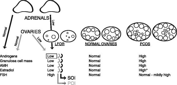 (ii) Already noted, the current definition of adrenal insufficiency does not include insufficiency of the adrenal zona reticularis, which produces androgens,7 but adrenal insufficiency is generally considered an autoimmune condition, suggesting that this may also apply to insufficiency of the zona reticularis. If that is assumed to be the case, POA, POI, and HH-PCOS would have to be considered autoimmune conditions with adrenal epitopes as causes for these conditions, as already suggested by Bakalove et al in 2005,9 even though the ultimate effects are ovarian, which would explain why decades of searches for ovarian epitopes in association with POA and POI have remained basically fruitless. Only one such epitope has been described, and it appears only in patients with Addison’s disease, causing the very rare picture of autoimmune oophoritis.10
