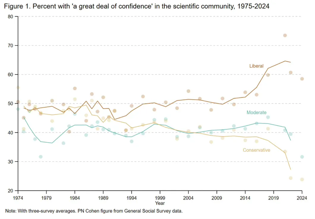 They are best explained with a short introduction to the subject: building on two earlier studies, Cohen updated data to 2024 in determining how the U.S. perceives societal confidence in science based on the political identity of individual citizens. The study question, in other words, was how Liberals, Moderates, and Conservatives from the mid-1970s to now have perceived the standing of science in society. As this study basically only updated two prior studies, it was already known that differences between these three subpopulations existed. For that same reason, we also do not address the study design (and its weaknesses), assuming real-world experience from a very large population cohort.