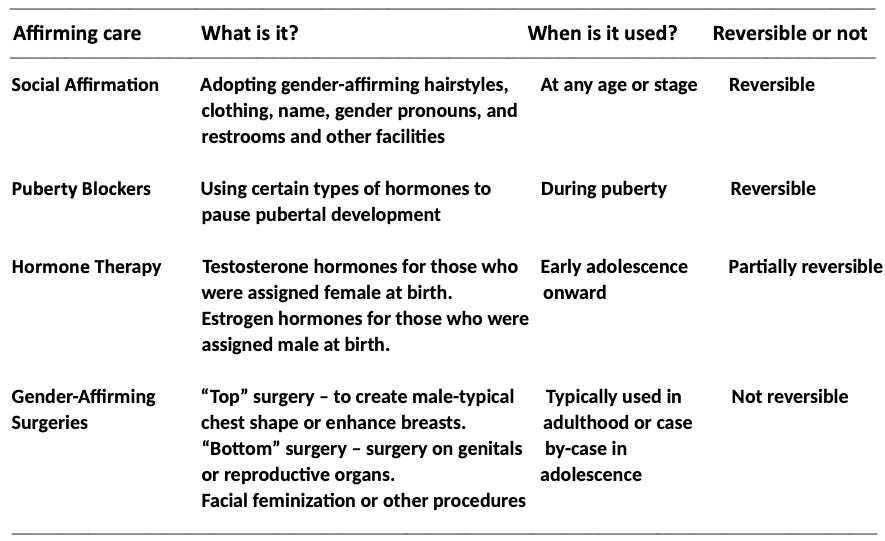 This is confirmed by the Table below that completes the document and clearly supports all aspects of gender-affirming care—at least on a “case-by-case basis” in childhood and adolescence: