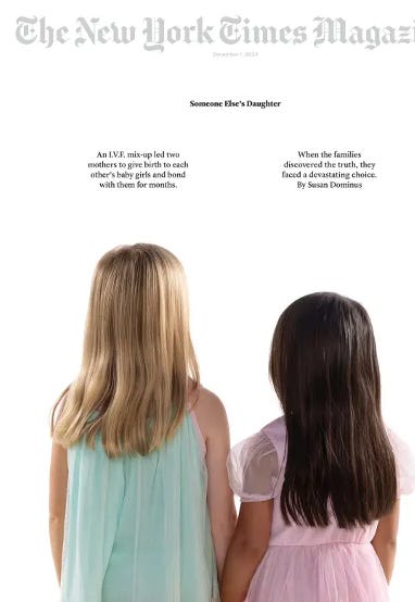 Briefing: The unfortunate embryo mix-up between two infertile couples several years ago in a Los Angeles area in vitro fertilization (IVF) clinic was just resurrected by The New York Times Magazine in a terrific cover story on December 1, 2024 (see figure below) (1). There are several reasons why this article deserves special attention. First, though considering the millions of IVF cycles performed in the U.S. since the birth of the first U.S. IVF offspring in 1981, fortunately, it is an extremely rare event, it never hurts, from time to time, to steer-up easily setting-in administrative complacency to minimize such occurrences. But what really makes this article so special are the writer’s descriptions of the discovery of the mix-up and what then followed. And, yes, some incorrect comments cited in the article by—who else—malpractice lawyers, are here also addressed.