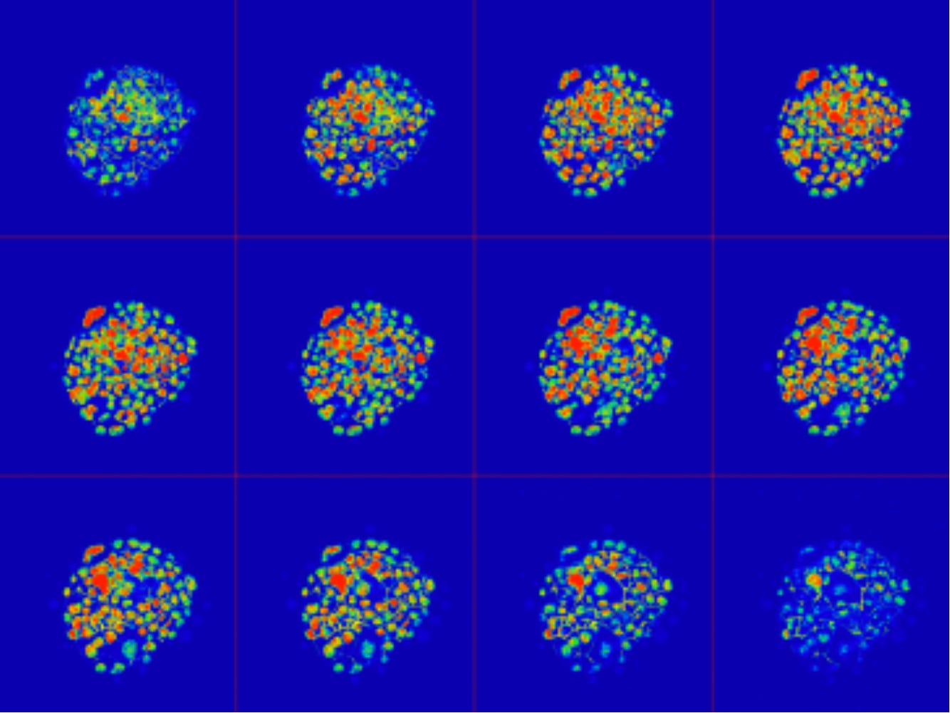 Figure 3. With the latest technologies available to scientists at the Center for Human Reproduction (CHR) and elsewhere, human embryos can be explored at very high magnification and in an intact state. Here is a gallery of sequential optical sections through an embryo made at the CHR that had three pronuclei in it after fertilization. The CHR laboratory cultured this embryo for 4 days and it resulted in a blastocyst that seems to be eliminating a chromosomally abnormal cell shown at 11 o’clock (red nucleus).