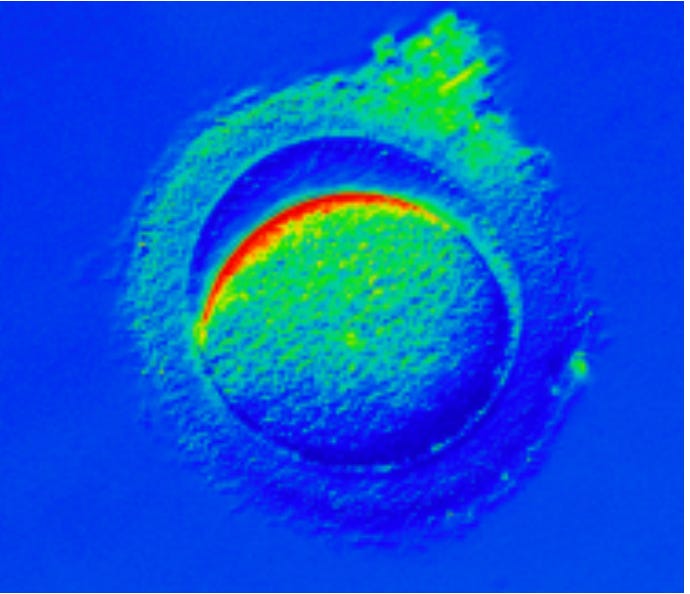 Figure 1. demonstrates an egg shortly after being fertilized by ICSI. Quite often, the egg contracts away from the zona pellucida, a sign that forces are being generated in the cytoplasm that will rearrange the various organelles so that they are equally distributed each time the embryo divides by mitosis.