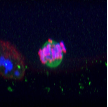 Demonstrates tripole. Too many cooks (centrosomes) sometimes spoil the recipe, leading to spindles in this case with three poles, a situation that nearly always will result in an abnormal number of chromosomes in “daughter” cells.