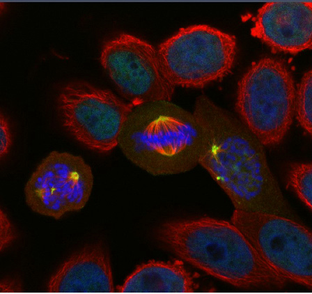 Demonstrates h14. The infamous HeLa cells shown here sometimes get it “right” and sometimes not. Three dividing cells occupy the center of this image, representing steps in the mitotic process that coordinate chromosome positioning (blue) with microtubules in the spindle (red) and special organizers known as centrosomes (in yellow).