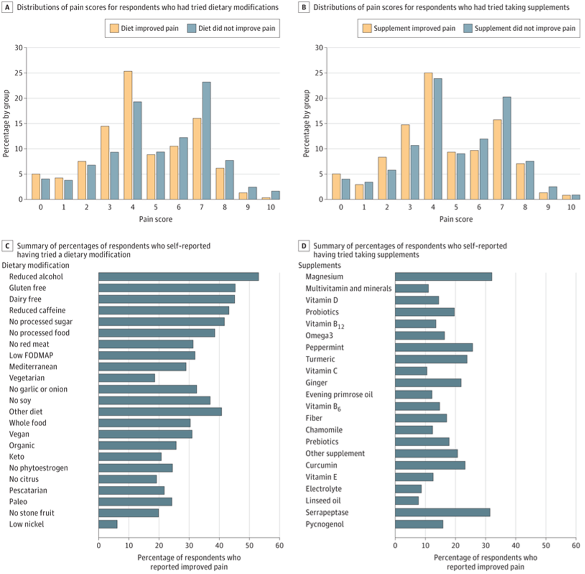 The above figure reports the number of survey respondents who reported using diets or supplements. It is difficult to make much detailed sense from this study (even aside of the fact that survey studies are notoriously unreliable); but there are nevertheless a few interesting observations to be made: For example that anti-inflammatory diets, reflected in no gluten and dairy intake, were the second and third most frequently taken steps is of interest and makes sense, though we must admit that the fact that alcohol was the most frequently excluded dietary component, was somewhat of a surprise.