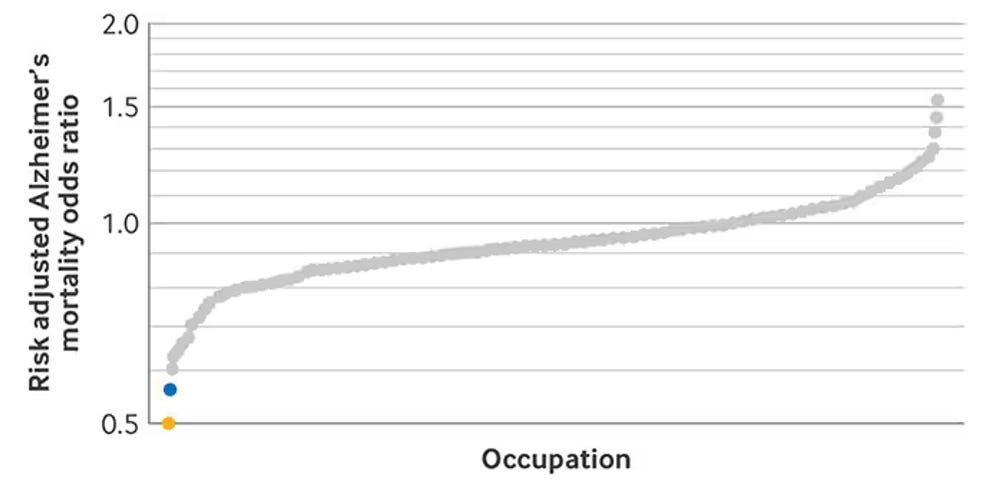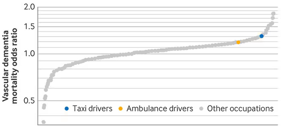 The blog was motivated by a more recent paper that had appeared in the BMJ (3) and assessed disease mortality from Alzheimer’s among taxi and ambulance drivers, which demonstrated – this time in a very large patient population of 8,972,221 – that taxi and ambulance drivers, indeed, demonstrated the lowest death rate from Alzheimer’s among 443 professions during the period of January 1, 2020, and December 31, 20223 (see figures above)