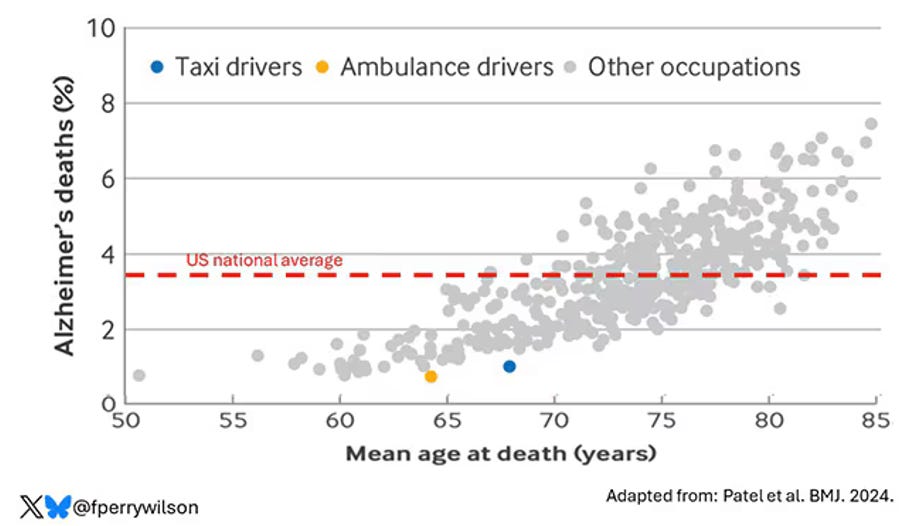 The only blog we are paying as much attention to as Eric Topol’s Ground Truth, is the Impact Factor, the amazing blog of Yale’s F. Perry Wilson MD, MSCE. In his December 17, 2024, posting he, once again, offers a masterpiece in statistical clarity by explaining the curious reasons why taxi drivers apparently are protected from Alzheimer’s disease. And – yes – this is not a misprint; they really appear protected (1)!