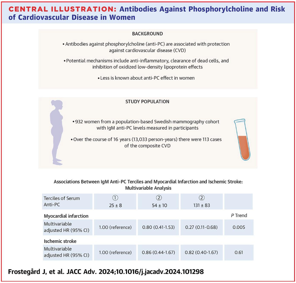 Most of related research has, however, so-far been done only in men. In a very interesting article in the JACC Swedish investigators now determined the role of IgM anti-PC on the incident of CVD among women. In a total of 932 women, age 66 ± 6 years, IgM anti-PC levels were measured. Prospective associations with any first CVD, ischemic heart disease (IHD), myocardial infarction (MI), and ischemic stroke were assessed, with the model adjusted for potential confounding factors.