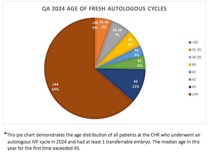 Completing our center’s 2024 data analysis of IVF cycle outcomes, we were, for the second year in a row, surprised by the results. Once again, in just one short year between 2023 and 2024, the CHR’s median patient age increased by a full year — from age 44 to age 45. What makes this such a remarkable result is not only the significant difference to the median age at other IVF clinics across the U.S. (which has remained stable at age 36 for years, according to SART and CDC reports), but also the fact that in the last two years, our center’s median age has increased by a full year each year, while the median age at other clinics across the country has remained the same. This discrepancy holds major clinical — and, even more importantly, societal and policy — relevance, which we will explore in more detail.