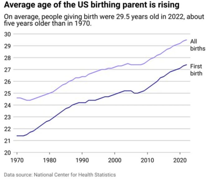 The principal reason why the U.S. and many other countries face such contradictory demographic trends is the fact that women are delaying childbirth. The later they start trying, the more likely it is that by that time, they will have developed a fertility problem. Figure 1 demonstrates the increase in age at first birth and, cumulatively, for all births.