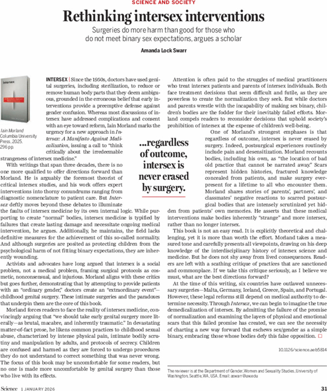 And also related and very timely, Amanda Lock Swarr in Science13 reviewed a book by Iain Morland who she calls – arguably – the foremost theorist of critical intersex studies. The title of the book is “Intersex” and Moreland’s key criticism of current clinical practice is that - “… regardless of outcome, intersex is never erased by surgery.” The question then, of course, becomes, why would anybody expect surgery to work in transgender situations (see below)?