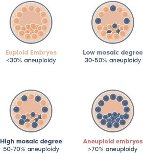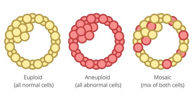 And then there is, of course, aneuploidy (an abnormal set of chromosomes), - with the likelihood of aneuploidy in oocytes and embryos increasing with age. Figure 2 below schematically demonstrates how a blastocyst-stage embryo is diagnosed in what is called preimplantation genetic testing for aneuploidy (PGT-A) resulting in either a “normal’ (i.e., euploid) test result, in “aneuploidy” (all cells presumed to be aneuploid), and in a “mosaic” result (the embryo is presumed to have a mix of normal and abnormal cells.