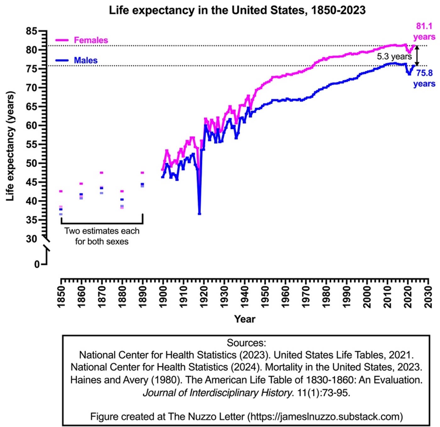 This, of course also means that it is the only major organ that almost completely enters senescence before death. But, interestingly, that was not always the case: As Figure 2 below demonstrates, life expectancies for females and males have been steadily increasing. Through roughly 1940, they indeed were quite similar, - though mildly favored females.