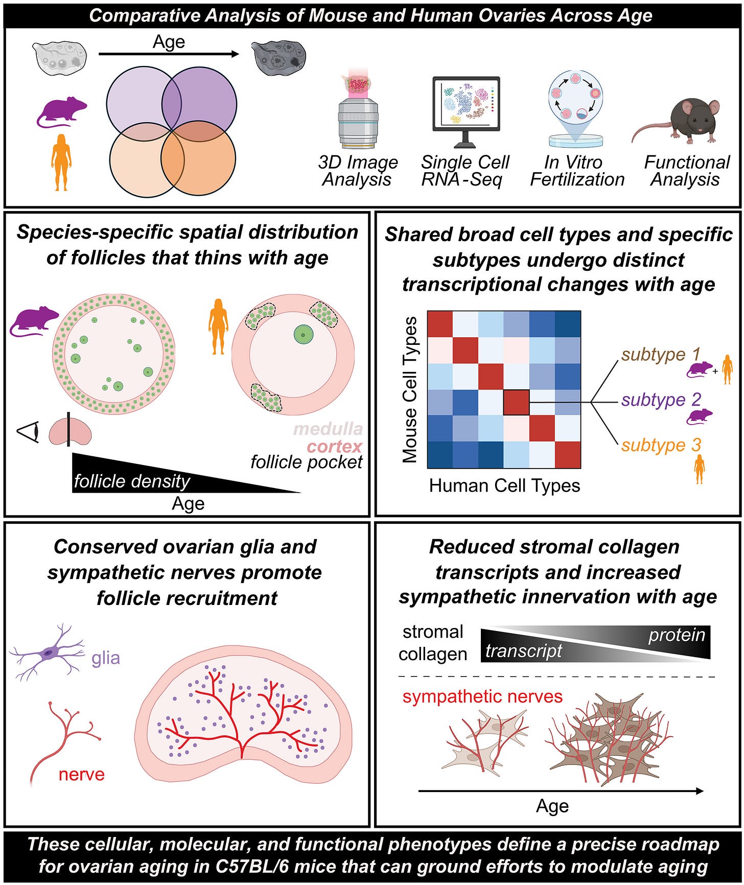 In mice, they recorded declining follicle numbers and oocyte competence during aging. In human ovaries, they studied cortical follicle pockets and decreases in density. Without going into detail, the study revealed probably more similarity than expected in the form of conserved cellular specialization. That included sympathetic nerves and glia, as well as species-specific dynamics of follicle depletion with age, oocyte maturation, and stromal remodeling.