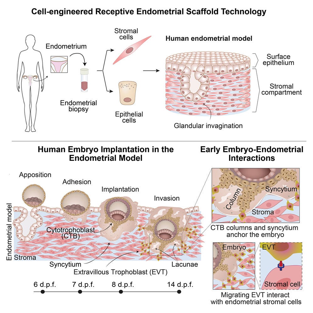 This European model is alleged to recapitulate the luminal, glandular, and stromal compartments of the superficial layer of receptive human endometrium. Human embryos as well as blastoids were allegedly implanted into the endometrial model, achieving post-implantation hallmarks including advanced trophoblast structures that underlie early events in placental development.