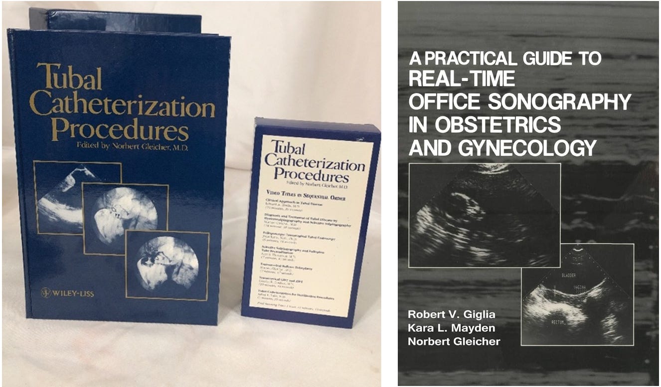The CHR team, indeed, ended up publishing a detailed book of instructions (with videotape) on how to perform transvaginal tubal catheterization on fully awake patients under minimal sedation (see below). Performing hundreds—if not thousands—of these for several years, the CHR maintained its own leaded X-ray suite (with mobile C-arm) until IVF pregnancy rates became so good that IVF replaced not only most major tubal surgeries, but also tubal catheterization procedures after CHR investigators discovered (and, of course, reported) that re-occlusions after catheterization were quite high within six months. Concomitantly, the CHR also developed special expertise in real-time office sonography, as the publication of the book shown below attests to.