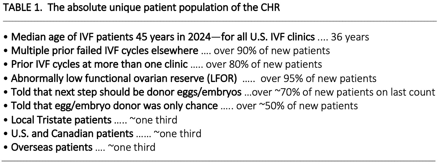Today, CHR has effectively become a global “last-resort” fertility center. Table 1 below summarizes the truly unique characteristics of CHR’s current patient population.