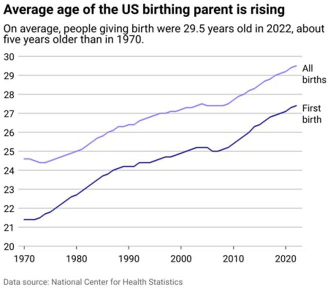 The principal reason why the U.S. and many other countries face such contradictory demographic trends is the fact that women are delaying childbirth. The later they start trying, the more likely it is that by that time, they will have developed a fertility problem. Figure 1 demonstrates the increase in age at first birth and, cumulatively, for all births.
