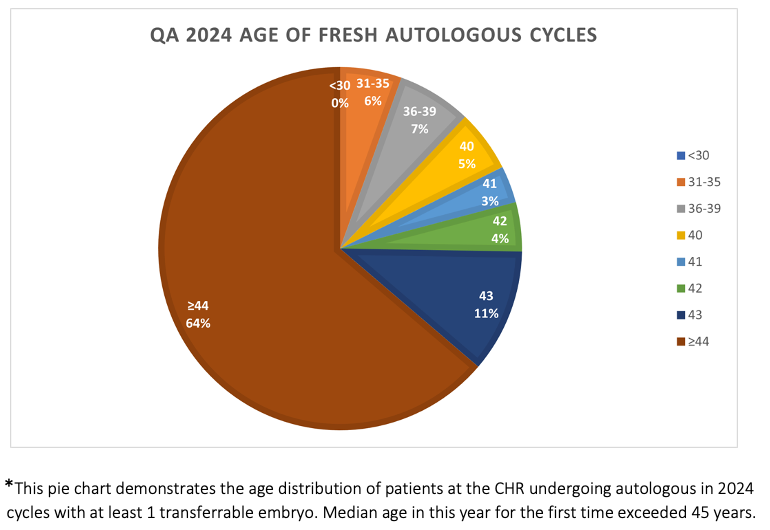 The CHR’s plight, on the other hand, came out at the other extreme of the spectrum. As the relative percentage of patients above age 43, especially in most recent years, has been quickly growing, the CHR became known worldwide as one of the very few IVF centers where infertile women - even at more advanced ages - would still get serious treatment attempts with use of their own eggs, offering surprisingly reasonable pregnancy and live birth chances (we in 2023 for the first time reached a 10% ongoing clinical pregnancy rate for women who produced at least 1 embryo in their cycle; by 2024 – as noted above - we reached a 12% ongoing clinical pregnancy rate, considering the patient population at the center, an unimaginably excellent outcome.